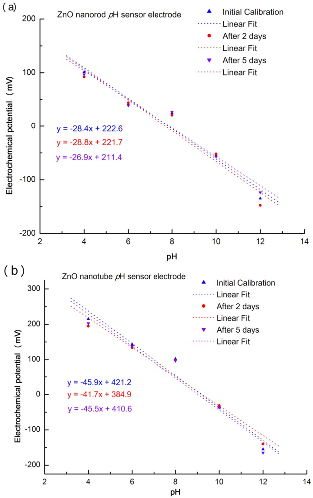 Figures 4(a),(b) show good repeatability of the ZnO nanotube and nanorod pH sensor electrodes in various buffer solutions. We took 10 developed ZnO nanotube and nanorod sensor electrodes (five ZnO nanotube electrodes and five ZnO nanorod electrodes. They have the same dimensions). The responses of the sensor electrodes were separately measured in buffer solutions of pH 4, 6, 8, 10 and 12 for three experimental measurements (initial calibration, after two days and after five days). Here, the same ZnO nanotube sensor electrode or ZnO nanorod sensor electrode was used in all three measurements at a specific pH solution. The sensor electrodes were carefully washed with de-ionized water after each measurement to clean the surface of the sensor electrodes. All these results show that the ZnO nanotube or ZnO nanorod pH sensor display good reproducibility, repeatability and long term stability.