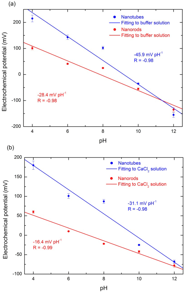 Experimental measurements of electrochemical potential vs pH comparison curves for ZnO nanorods and nanotubes immersed in (a) buffer and (b) CaCl2 solutions.