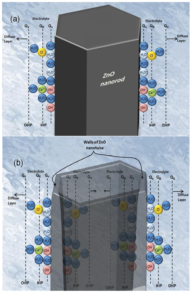 Schematic diagram showing the charge distribution at the metal oxide-electrolyte interface with surface charges in CaCl2 for (a) ZnO nanorods and (b) ZnO nanotubes.
