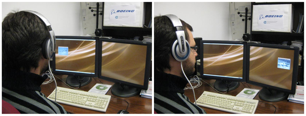 In order to validate the proposed prototype of the head tracking system, several experiments have been carried out with two screens and the camera located between them. The headphones with the infrared pattern have been used to track the operator. Summarizing, the system is composed by: