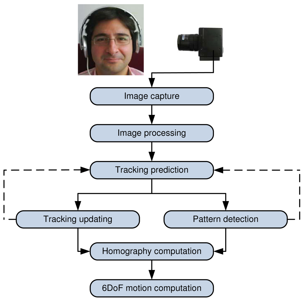 6DoF head tracking moves one step forward and allows estimating the complete position and orientation of the user's head in real time. Most of the approaches can be divided into two groups: based on human face detection and based on visual pattern detection, both using image processing. In the first group, several research works [4–6] have shown robust estimation processing stages of the position and orientation of the user's head. In those cases, model-based head detection is used to initialize the tracker and also to estimate the 6DoF localization of the head. The main concern is usually related to the reliability of the face detection stage. Actually, many recent works have been devoted to increase the robustness of this kind of approaches. For instance, in [7] particle filtering and complex tracking policies are used to implement a robust system.