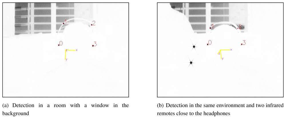 Images showing the detection process during the operation of the system. The four infrared LEDs detected are marked by red dots over the raw images captured by the camera (notice that the colors are inverted). The computed coordinate frame is also shown as an overlay on the image captured.(a) Detection in a room with a window in the background(b) Detection in the same environment and two infrared remotes close to the headphones