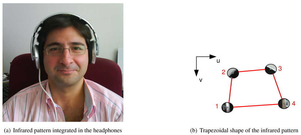 Off-the-shelf headphones have been modified to include the infrared pattern with four LEDs (Figure 7 shows a photograph of the system). The headphones work as the usual ones, with the difference that a connector to power the LEDs has been added. In particular, this connector is an USB cable that allows taking the power directly from the computer, simplifying the setup of the system in its current prototype stage (the cable could be substituted by a set of batteries attached to the headphones).