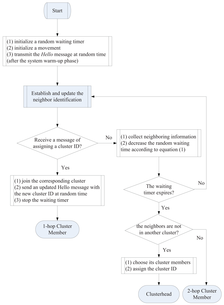 LCC [42] is designed to minimize clusterhead changes. However, with the increasing node speed, the migration of the cluster members towards others clusters and the role reassignment between two neighboring clusterheads may lead to frequent clusterhead changes. Moreover, a ripple effect may be generated due to the propagation of clusterhead changes in the LCC scheme. In the purpose to generate balanced clusters, [43] restricts both diameter and size of the cluster. Two thresholds are used to control the size of generated clusters and the distances between cluster members and their corresponding clusterhead are at most two hops. However, the logic behind the setting of the two thresholds and the process of achieving inter-cluster communication are not provided. Comprehensive surveys of recently proposed clustering algorithms for mobile ad-hoc and sensor networks can be found in [44, 45].