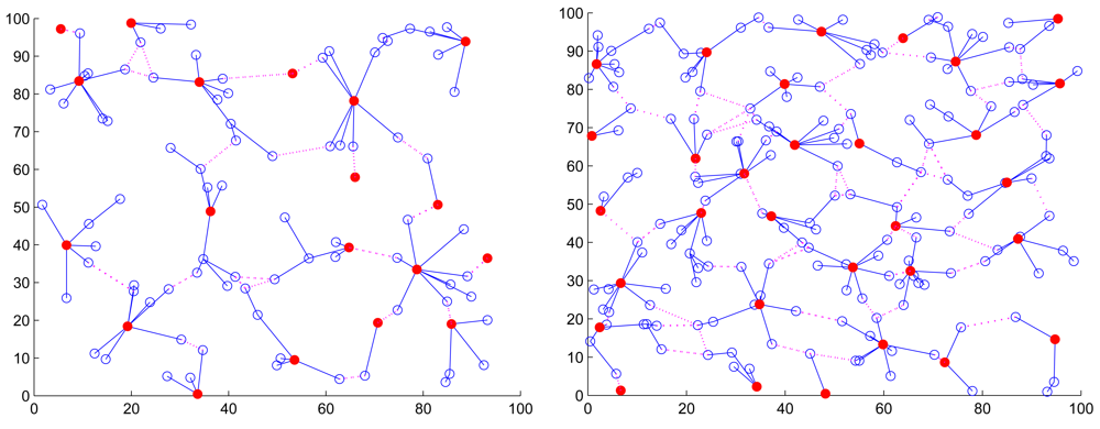 Figure 15 shows the comparison of a typical network topology applying the proposed scheme (left) and that using the MOBIC algorithm (right). As mentioned in Section 2., MOBIC presents an aggregate local mobility metric for the cluster formation process such that mobile sensors with low relative speed have the chance to become clusterheads. However, it may not work well in a dynamic environment due to the disregard of mobility manners in cluster maintenance. On the other hand, the proposed approach configures the network autonomously with cluster formation parameters and considers mobility manners in cluster reformation phase when facing the topology changes, which manages the topology effectively.