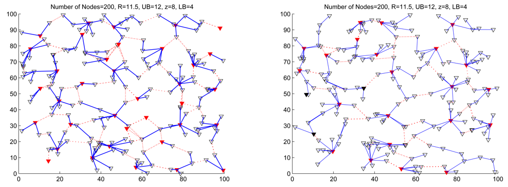 Notice that since the neighbor sensor properties depends on the type of sensor mobility occurring in the network, the upper bound UB and the lower bound LB of the cluster size are given according to the number of sensors and issues on the sensor mobility model. Moreover, these parameters have the effect on the network maintenance since they may determine the frequency of topology change in mobile networks. Instead of using arbitrary settings for these constraint parameters [38], the analysis of the upper and lower bounds is detailed in Section 4.1.
