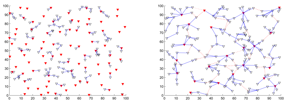 Example of cluster merge process of a random network; the network topology before cluster merging (left) and the network topology after cluster merging (right). The red ∇s represent clusterheads and the black ∇s (right) represent role changes from a clusterhead to a cluster member in the merged cluster.