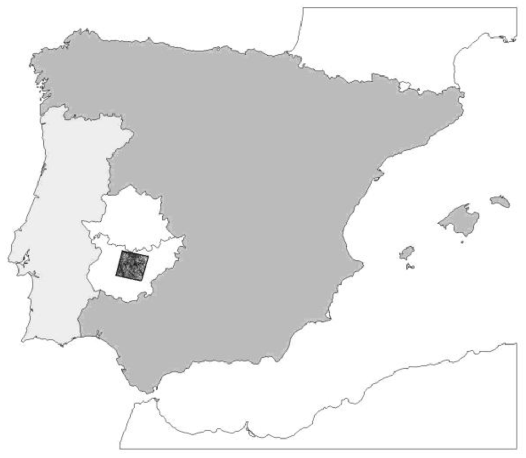 The test area was a roughly 60 × 60 km area in the Spanish province of Badajoz, which is located in Extremadura in southeastern Spain (Figure 1). Elevation in this area ranges from 77 to 855 m, with an average of 360 m. The area was captured by the ASTER sensor on 4 August 2000.