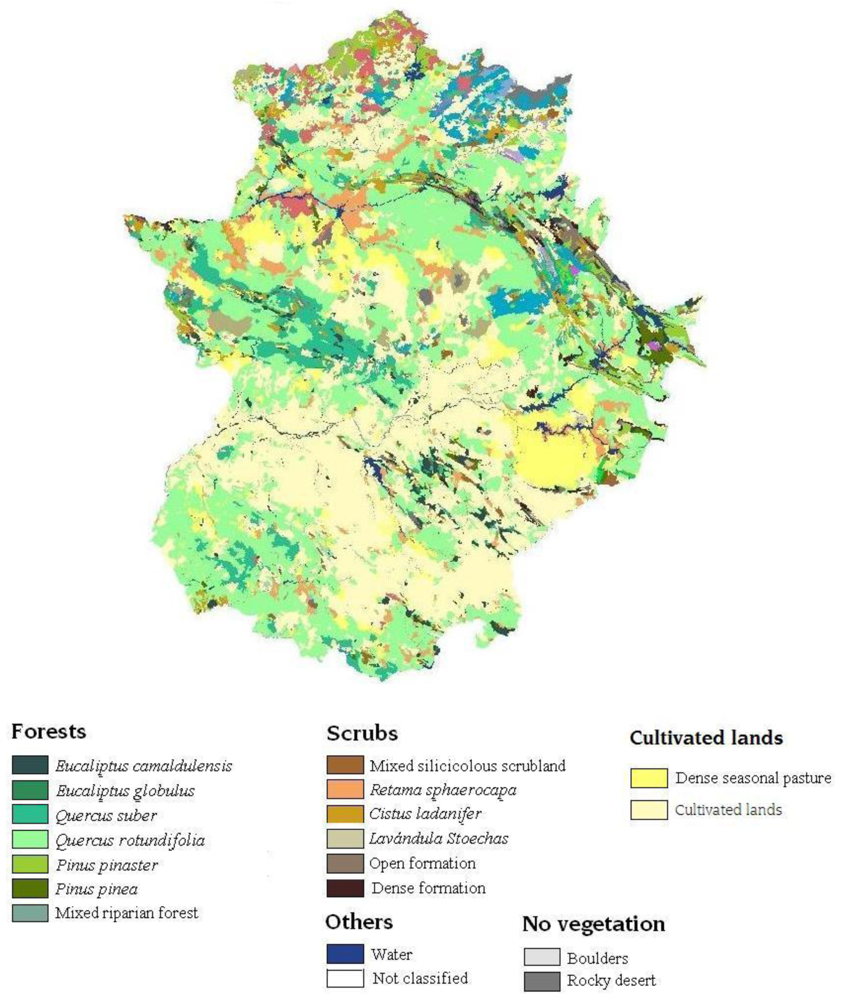 The Regions of Interest (ROIs) used in the classification process were obtained from the Spain forest map (see Figure 2). This map provides a polygonal distribution of territory based on homogeneous vegetation units characterised by information on vegetation type. This study used a version synthesised by the Extremadura Regional Government in 2001 [37]. This version includes the main forest categories groups existing in the region. Taking only the area under study into account, a total of 18 categories must be analysed (see Table 2).