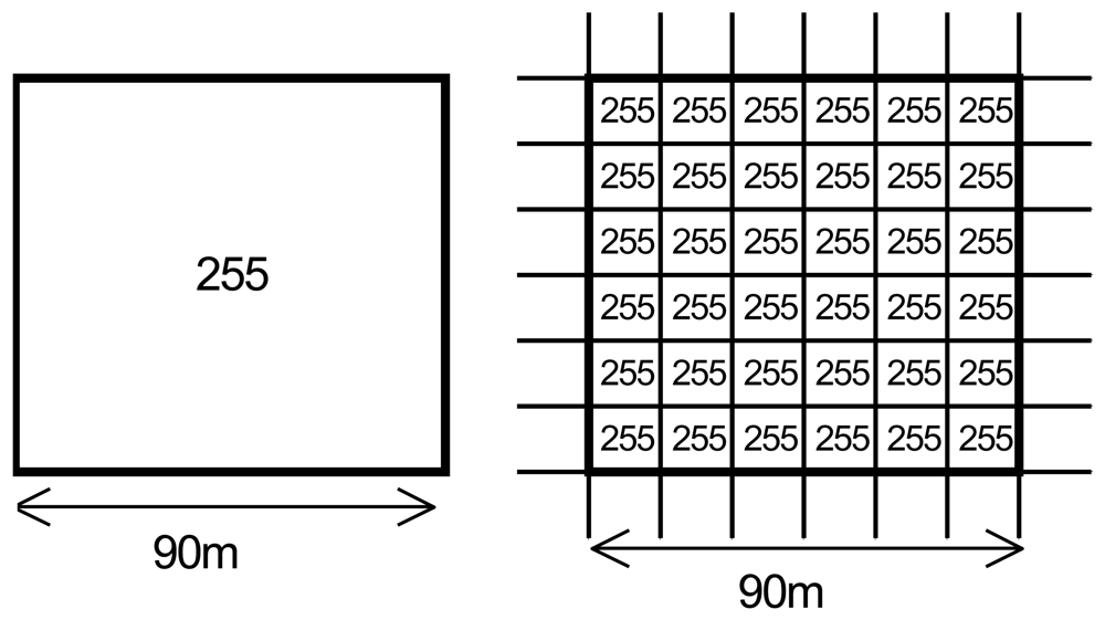 Second, we re-sampled the SWIR and TIR bands to obtain the same geometric resolution for the entire image. With this action, no alteration was introduced to the original pixel information because the re-sampling was performed from a larger pixel resolution up to a smaller pixel resolution (see Figure 3). This re-sampling was necessary because the classifier requires homogeneous data to operate, and this method is simpler than introducing different band resolutions for different classifier calculations.
