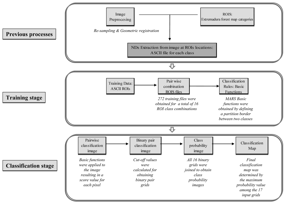 In this study, the data were pre-processed prior to any classification procedures (see Section 3.1). A brief introduction to the MARS algorithm is presented before developing different classifications (see Section 3.2.). Two different processes were performed in this study. On the one hand, we generated three traditional classification maps using the ML, parallelepiped and MARS algorithms (see Section 3.3.). On the other hand, class probability maps were also obtained using these three algorithms; their accuracies were calculated using the AUC statistic (see Section 3.4.).