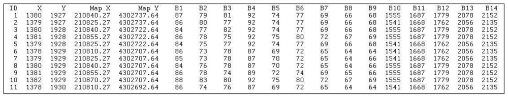 For MARS classification, it is necessary to know the digital numbers (DNs) of pixel values at all 14 bands. Thus, once all shp ROI polygons were superimposed onto the ASTER scene, we performed an ASCII exportation using ENVI software. The 17 resulting files contained image and map coordinates of all pixels inside the corresponding ROI and their corresponding DN values for all bands. See Figure 5.