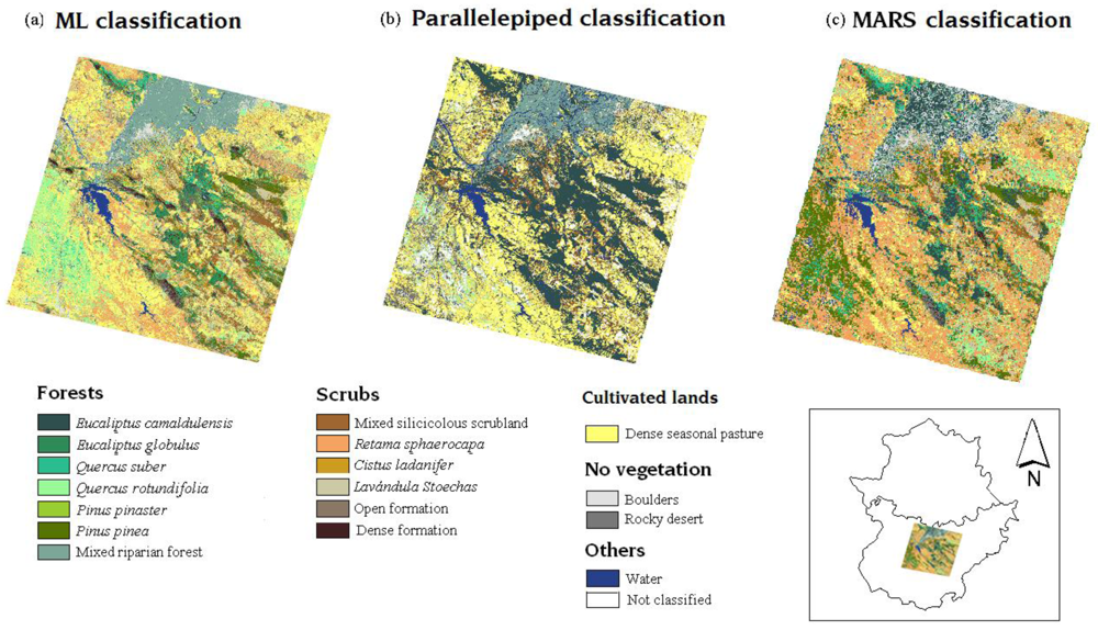 (a) ML classification map, (b) Parallelepiped classification map, (c) MARS classification map.