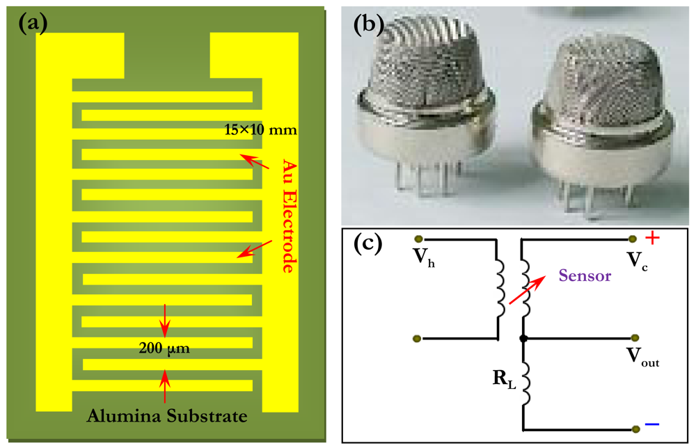 The microstructures of the solid powder and thick film were characterized using X-ray diffraction (XRD) and atomic force microscopy (AFM), respectively. For the XRD, an XD-5A diffractometry with Cu Kα operated at 30 kV and 100 mA was used. As for the AFM, we applied a high-speed CSPM4000 microscopy with contact mode, which accurately images surface topography. Gas-sensing properties were measured using a static system controlled by a computer. We used a micro-injector to introduce the VOCs into the chamber and manipulate the VOC concentrations via tuning the input VOC amount alone due to the fixed chamber volume. During the measurement, the sensor was powered at 373 K for 120 h in air and operated at 303 K under a relative humidity of 40%. The gas sensitivity was defined as a ratio of resistance (R0) in air to that in test gas (R). As for the measurement of voltage, we adopted a circuit shown in Figure 1(c), which could be divided into a heating and measuring part. Clearly, the output voltage varied with the type and concentration of test gas.