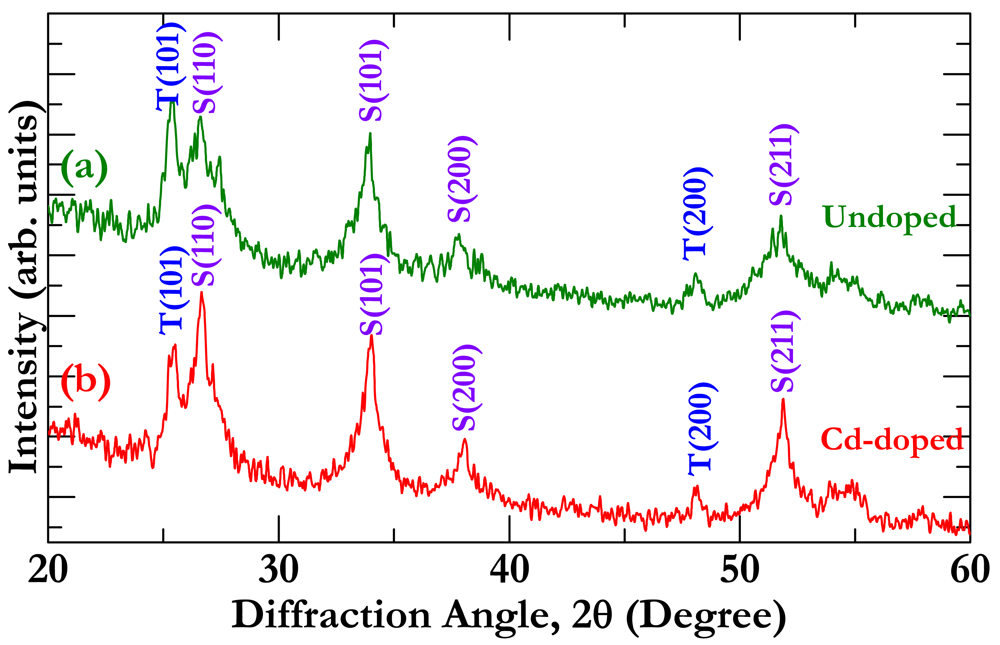 XRD spectra for (a) undoped and (b) Cd-doped TiO2-SnO2 powder. Note that the T represents TiO2 and the S represents SnO2.