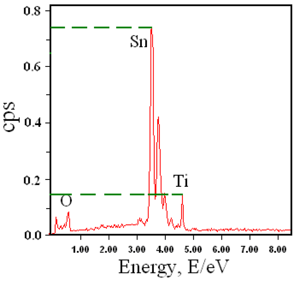 To analyze the elemental species of the thick film, we further show in Figure 3 the energy-dispersive X-ray spectroscopy (EDS) spectrum. We notice that the film is mainly composed of Ti, Sn, and O, in accordance with chemical composition of the prepared powder. The mass ratio of Ti to Sn is estimated to be about 1:5 (Figure 3), demonstrating that we have successfully synthesized the desired composite. Figure 4 shows an AFM image of the surface morphology for both the pristine and doped thick film. Many uniform islands can be observed on the surface, which shows that both films have good crystal shape and even grain size. In comparing the surface morphology of pristine TiO2-SnO2 film with that of doped one, we see that they are similar, which means that the Cd doping affects surface morphology only slightly.