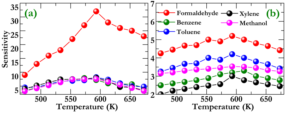 To investigate further how the doping influences sensing properties, we tested the responses of the pristine and doped sensors to different types of VOC gases such as formaldehyde, benzene, toluene, xylene, and methanol. Figure 5(a) shows gas sensitivities under various temperatures, where one can see that the doped sensor exhibits exclusive selectivity to formaldehyde. It should be noted that an understanding of the underlying origin of this exclusive selectivity has not been developed yet, which will be an important future task. The highest sensitivity to the formaldehyde is estimated to be 32, much higher than that to other examined gases (less than 10). Evidently, this demonstrates that the Cd-doped sensor shows good selectivity to formaldehyde, which is therefore promising for practical device applications. From this figure, we further determine the optimum operating temperature to be about 593 K because maximum sensor response to the formaldehyde is observed at this temperature. This can be understood by considering that a dynamic equilibrium state will occur between the initial adsorption and the subsequent desorption, as the operating temperature keeps increasing. The equilibrium state therefore gives rise to a maximum sensitivity, as seen in Figure 5. Compared to the doped case [Figure 5(a)], the sensitivity of pristine sensor is much lower with a maximum value of less than 5 [Figure 5(b)], although the pristine sensor retains the highest sensor response to formaldehyde. We thus conclude that the Cd is an effective dopant in improving response and selectivity of TiO2-SnO2 composite to formaldehyde.