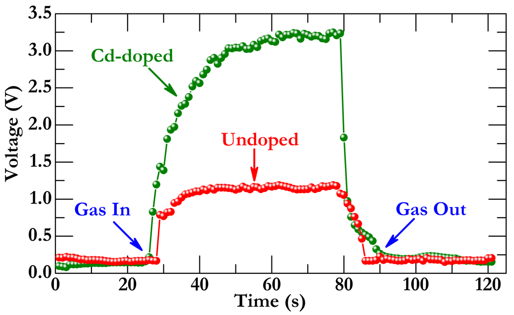Figure 7 presents a representative response-recovery characteristic for the sensor operated at 593 K under a formaldehyde gas concentration of 200 ppm. The response and recovery times are two key quantities for a sensor, which are defined as the time needed to reach 90% response (recovery) when gas is in (out). As seen in this figure, voltage for both the undoped and doped sensor increases sharply when gas is in but returns to its original state while gas is out. The major difference between the two cases is that the voltage for the doped sensor is substantially larger than that for the pristine one at working stage, verifying again significant effect of Cd doping on sensor response improvement. In light of the definition describe above, the response and recovery times for the doped sensor are evaluated to be about 25 s and 17 s, respectively, which meet the basic demands for an industrial application. These short times, together with the high sensor response and exclusive selectivity, suggest that the Cd-doped TiO2-SnO2 may hold the potential for developing a formaldehyde gas sensor.