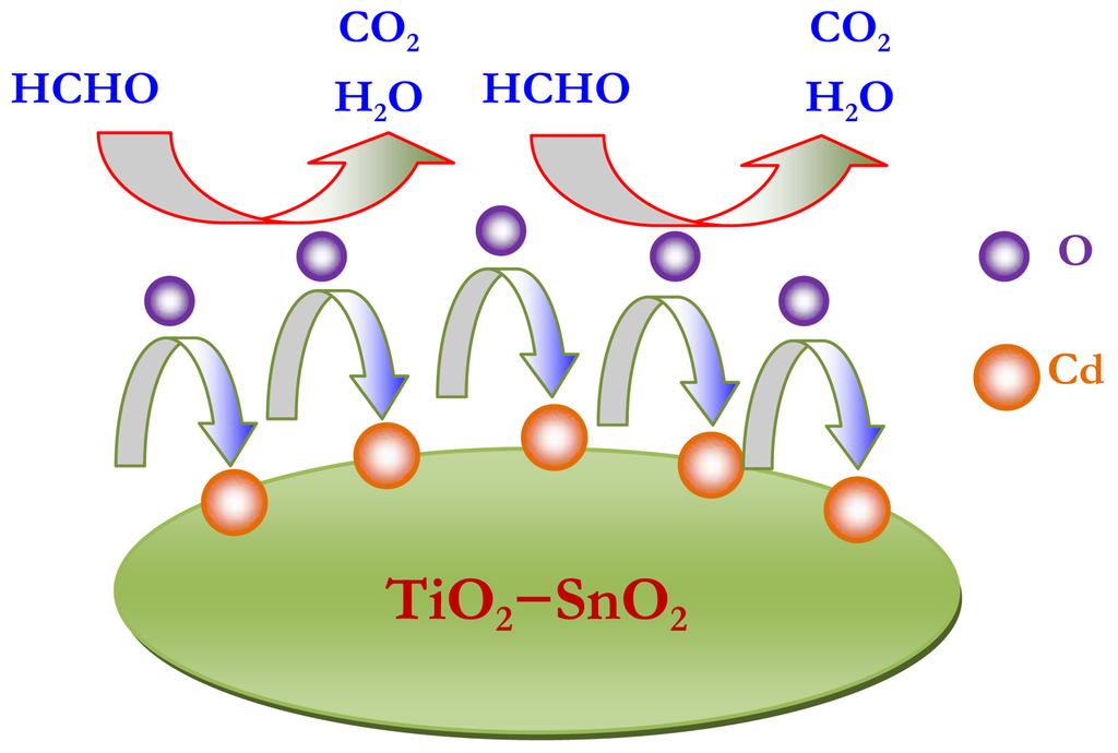 (3) gas sensor response may depend critically on the amount of pre-absorbed oxygen. The results presented in this paper demonstrate that the Cd-doped TiO2-SnO2 material has a significantly higher sensor response to formaldehyde than the pristine material. This enhancement of sensor response can be presumably attributed to the Cd additive, which may provide additional sites for adsorbing oxygen. Consequently, as reductive gas is introduced (Figure 8), more oxidization occurs probably on the Cd surface, which generates more electrons onto the TiO2-SnO2 surface. These electrons would enhance surface conductivity noticeably, which can therefore reduce surface resistance considerably [19–22], as observed in the response and recovery curves (Figure 7).