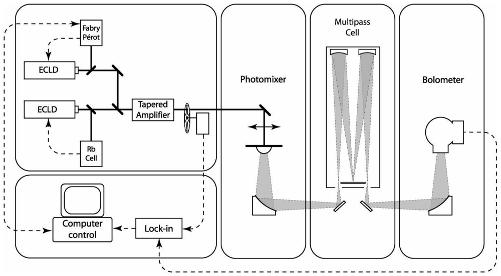 Photomixing or optical heterodyne was first demonstrated by Brown et al. in 1993 [12] who used it to measure the self-broadening of SO2 [13]. An optical beatnote is generated by mixing two visible lasers and is tuned to the desired THz frequency. The two-color laser beam is focused onto a photomixer element which is composed of a semiconductor with a charge carrier lifetime in the region of ≈300 fs. The semiconductor response is sufficiently rapid to follow the THz beatnote frequency while not responding to the higher frequency mixing components. The THz frequency is therefore transferred to the electronic domain by the optically driven modulation of the photomixer conductivity. A current is generated by the application of an electric field and is coupled to a pair of antennae radiating continuous-wave monochromatic THz into free space. A spectrometer based on this source can be divided into the following functional units: a dual frequency optical source, a photomixer device, a THz beam path including sample cell, and a detector. The spectrometer constructed at the Laboratoire de Physico-Chimie de l'Atmosphère (LPCA) is illustrated in Figure 1 and includes a multi-pass sample cell and a liquid helium cooled Si bolometer detector.