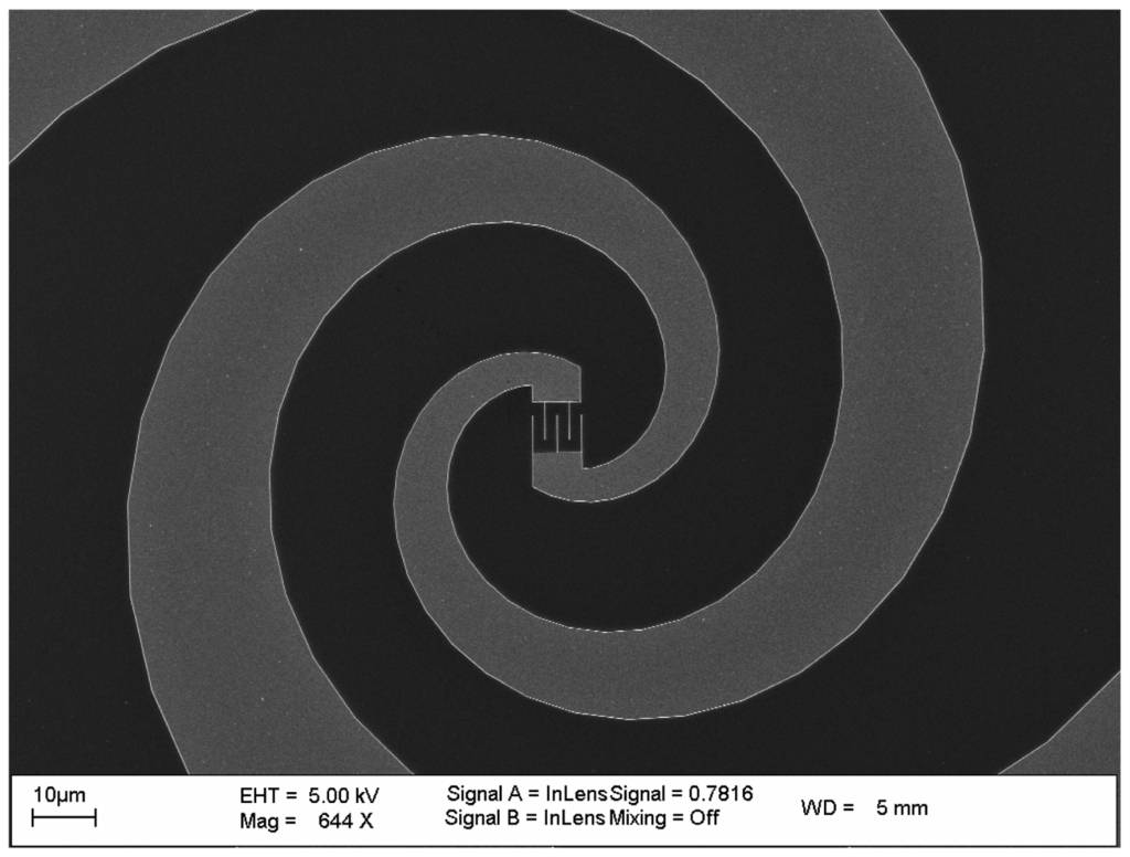 In the case of the LPCA spectrometer, the photomixer devices used are fabricated at the Institut d'Electronique de Microélectronique et de Nanotechnologie (IEMN). A layer of LTG-GaAs is grown by gas-source molecular beam epitaxy onto a standard semi-insulating GaAs substrate. The carrier lifetime may be measured by time-resolved photoreflectance yielding a typical value of 800 fs. The interdigitated photoconductor and the spiral antenna are defined by patterning a metal layer using electron beam lithography, Figure 2.