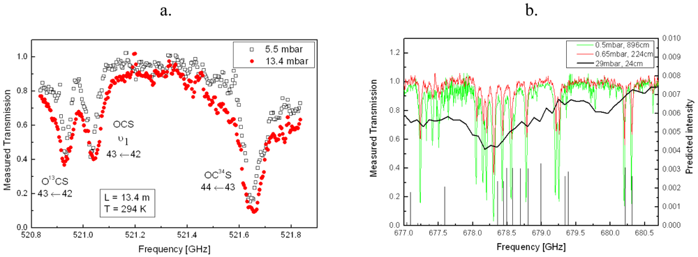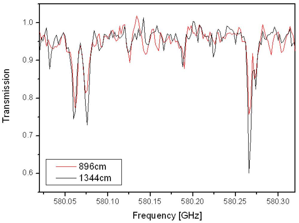 The OC34S transition at 521.7 GHz is distorted by an intense OCS line at 522.6 GHz. The O13CS transition is observed at 520.9 GHz and the line at 521.0 GHz is the excited symmetric stretching ν1 mode. The O13CS line has a tabulated intensity of 2 × 10−23 cm−1/(molecule.cm−2), indicating that for pure gases the spectrometer is capable of resolving line intensities as weak as 10−25 cm−1/(molecule.cm−2). The sensitivity is also demonstrated by the pure rotational spectra of vinyl chloride (C2H3Cl) for various path lengths (Figure 3b) [27]. A single pass with a path length of 24 cm required a pressure of 29 mbar to obtain a reasonable absorption signal, at this pressure no individual lines can be resolved. As the path length is increased lower gas pressures can be used and the lines can be resolved, increasing from 224 cm to 896 cm reveals further transitions.