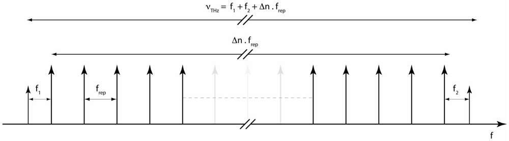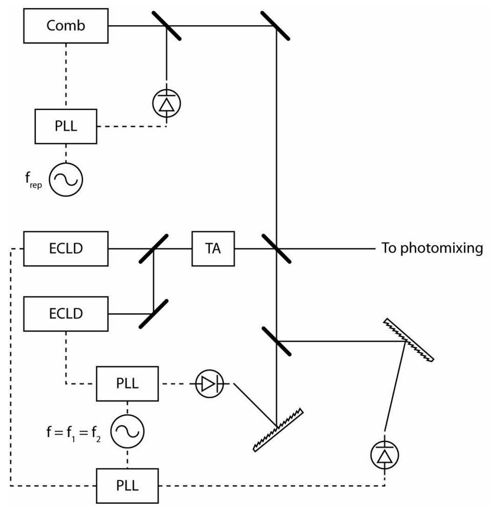 In the context of a photomixing instrument the source lasers can be phase locked to two different modes resulting in a difference frequency independent of the carrier offset. The two-color source is mixed with the frequency comb and dispersed by a grating allowing a small photodiode to select the optical frequencies corresponding to one of the cw lasers and a small number of frequency comb modes (Figure 4). The beatnote between the cw laser and the nearest frequency comb mode is phase locked to an electronic oscillator. In this manner both lasers are coherently locked to the frequency comb and the quality of the THz frequency synthesized depends on the stability and accuracy of the laser repetition rate (Figure 5). Measurement of the beatnote between the FC and the ECDL by a spectrum analyzer indicates a FWHM of approximately 100 kHz for an integration time of 100 ms.