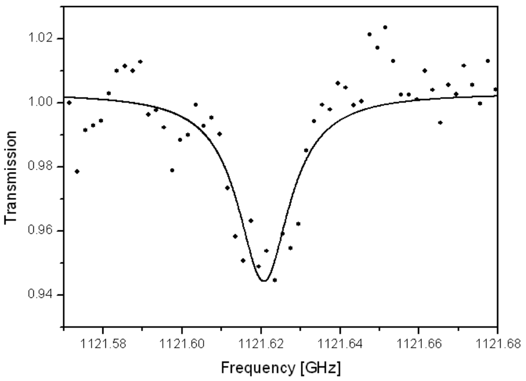Measured spectrum of cigarette smoke at a pressure of 2 mbar, a transition of HCOOH is observed with a path length of 20.16 m. Line intensity = 2.2 × 10−22 cm−1/(molecule·cm−2). The measured datapoints (filled points) are fitted with a Lorentzian absorption profile (solid line).