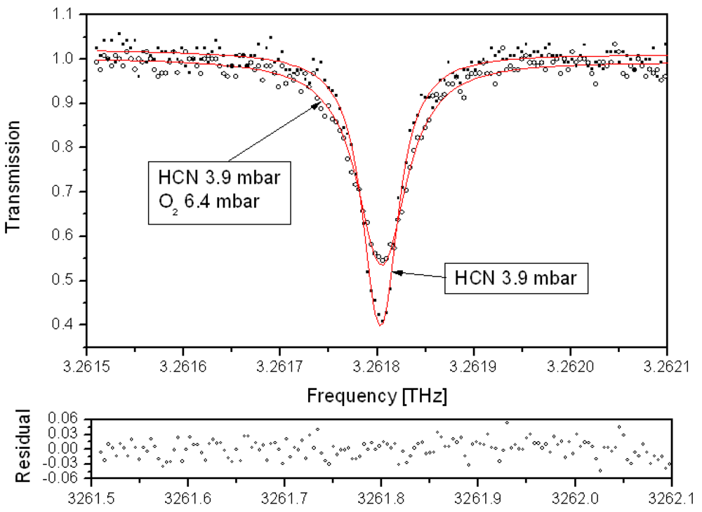 The large tunability and good spectral resolution of the photomixing instrument ensures that it is an ideal for the measurement of absorption profiles of the small linear molecules with a large permanent dipole moment. Hydrogen cyanide is present in comets, interstellar clouds, and in the atmospheres of several planets and moons like Titan [42,43]. Knowledge of its spectral parameters is important for star forming models as well as for monitoring industrial pollution [35]. The transition profile parameters are therefore tabulated in many spectroscopic databases such as HITRAN 2004 [44] where the air broadening coefficients for the pure rotational transitions J ≤ 29 are given by a polynomial based on measurements of parallel bands in the infrared [45,46], for values above J = 29 a constant value is applied due to the lack of experimental data. The photomixing spectrometer can however directly measure the absorption profiles of these pure rotational transitions, an example of the J = 37 ← 36 line at 3.26 THz is given in Figure 8 and represents the highest operational frequency of the instrument.