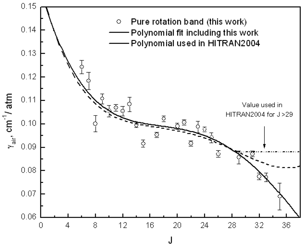 Air broadening coefficient of HCN measured over the frequency range 530 GHz to 3.3 THz. Measured values (open points), HITRAN 2004 polynomial (dotted line), updated polynomial for HITRAN 2008 (solid line).