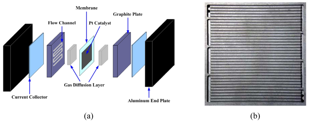 Schematics of a fuel cell assembly displaying different essential components of the system (a) and micro serpentine bipolar flow plate (b).