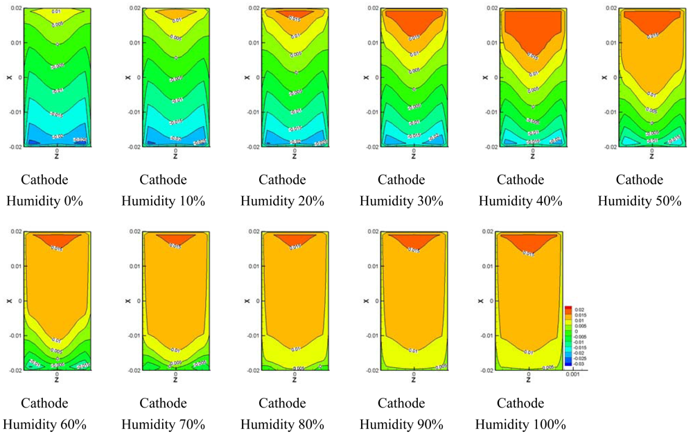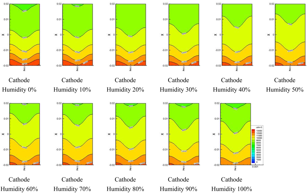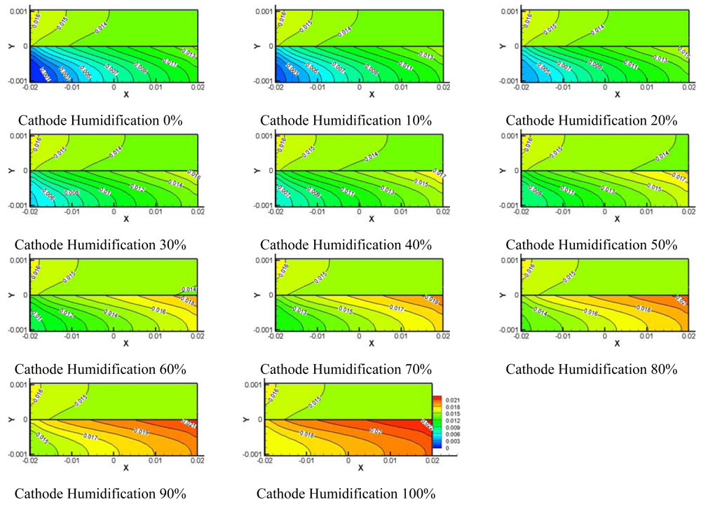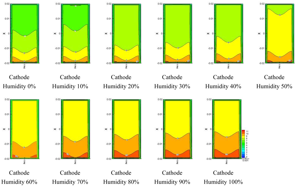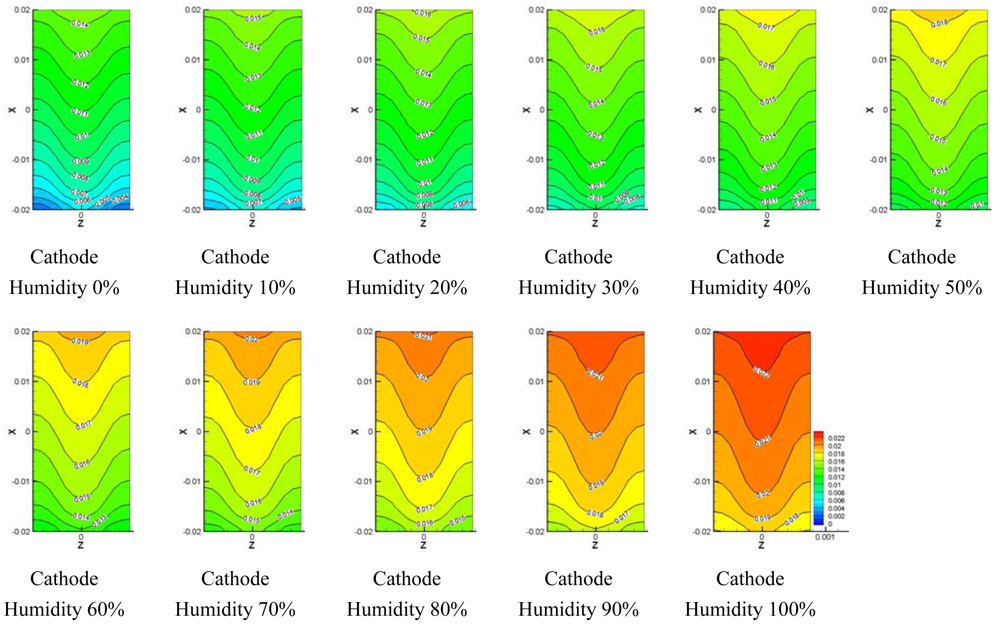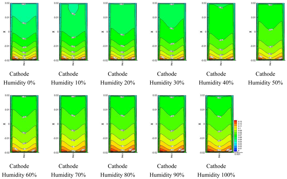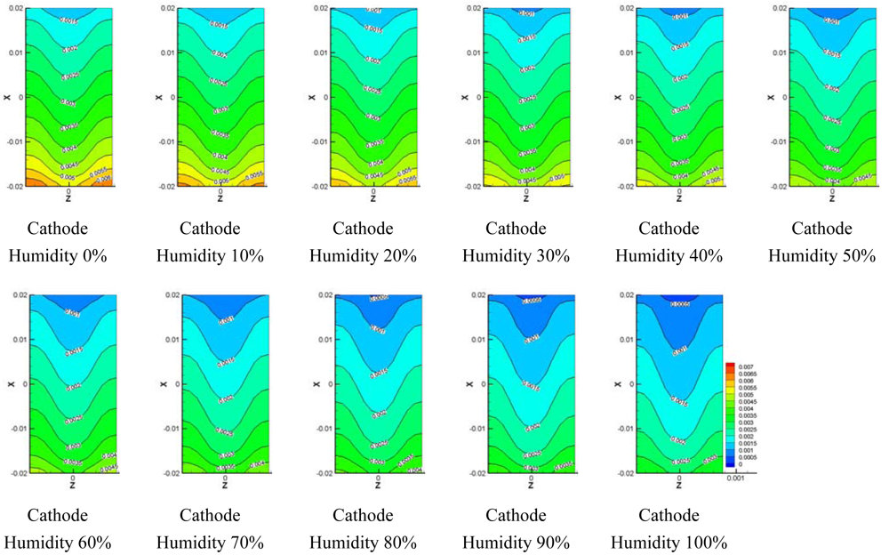 Figures 8–10 show comparisons of the distribution of oxygen and water concentration on the gas diffusion layer at different humidity levels at the cathode channel. Figure 8 shows the distribution of water concentration on the gas diffusion layer at the anode side. Figure 9 and 10 show the distribution of water and oxygen concentration on the gas diffusion layer at the cathode side.