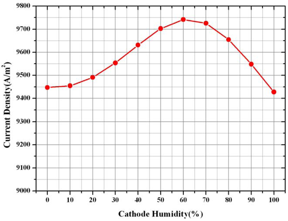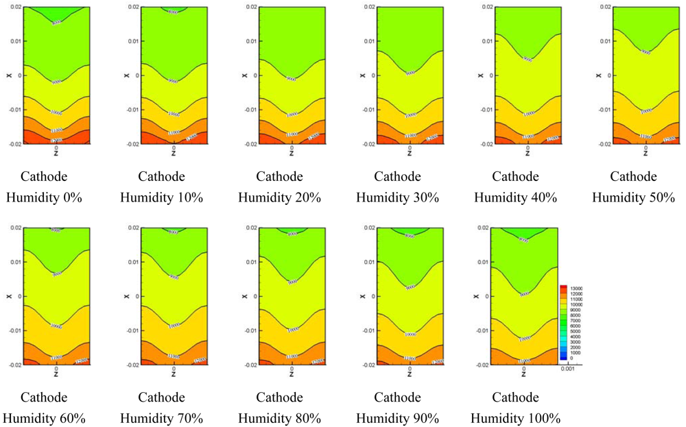 Figure 14 depicts the local current density at different relative humidity levels at the cathode side. The local current density was relatively high at the inlet of flow channel and low at the outlet of flow channel under conditions of 0–30% of low humidity at the cathode side. The entire area of the reaction had the constant level of local current density for the case of 40%–70% of humidity at the cathode side. However, the local current density was shown to be low for the case of 80%–100% relative humidity at the cathode side.