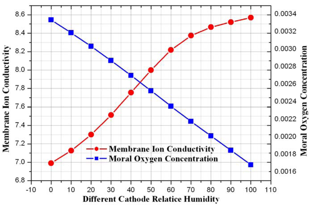 Figure 15 presents ion conductivity and model oxygen concentration at different cathode relative humidity cathode. It is confirmed that membrane ion conductivity was increased with increasing relative humidity at the cathode relative humidity and model oxygen concentration at the cathode is found to be increased with decreasing relative humidity.