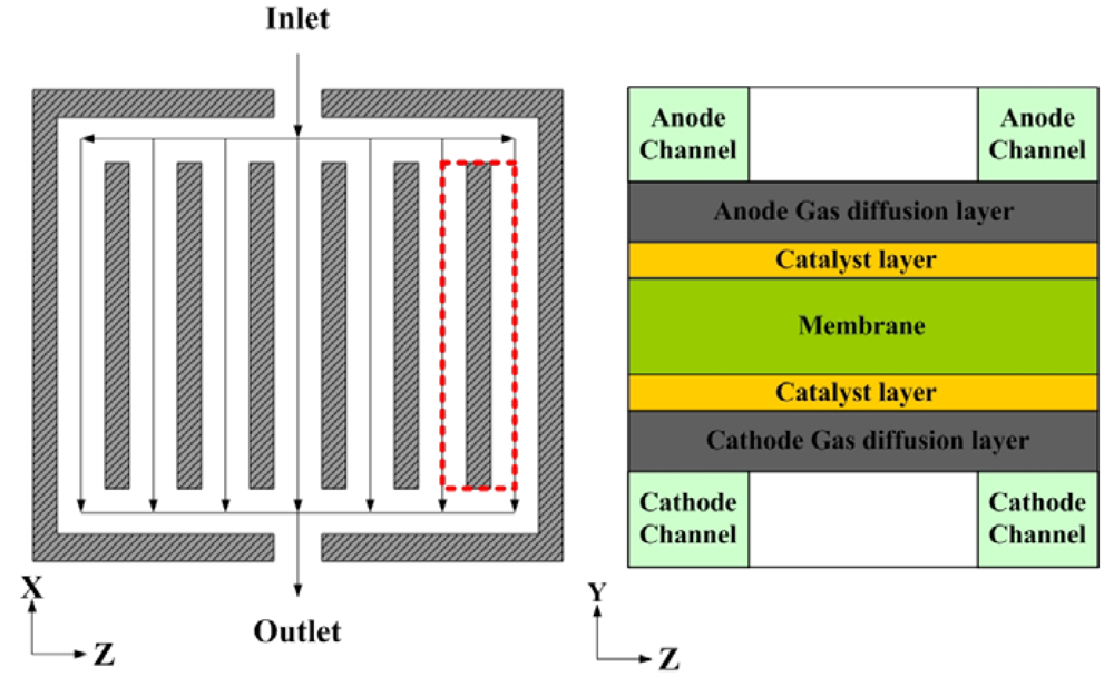 - Current density and membrane ion ConductivityI(x,y,z) is current density generated by electrochemical reaction, which can be expressed as:where σm(x,y,z) indicates the ion conductivity of membrane expressed as: