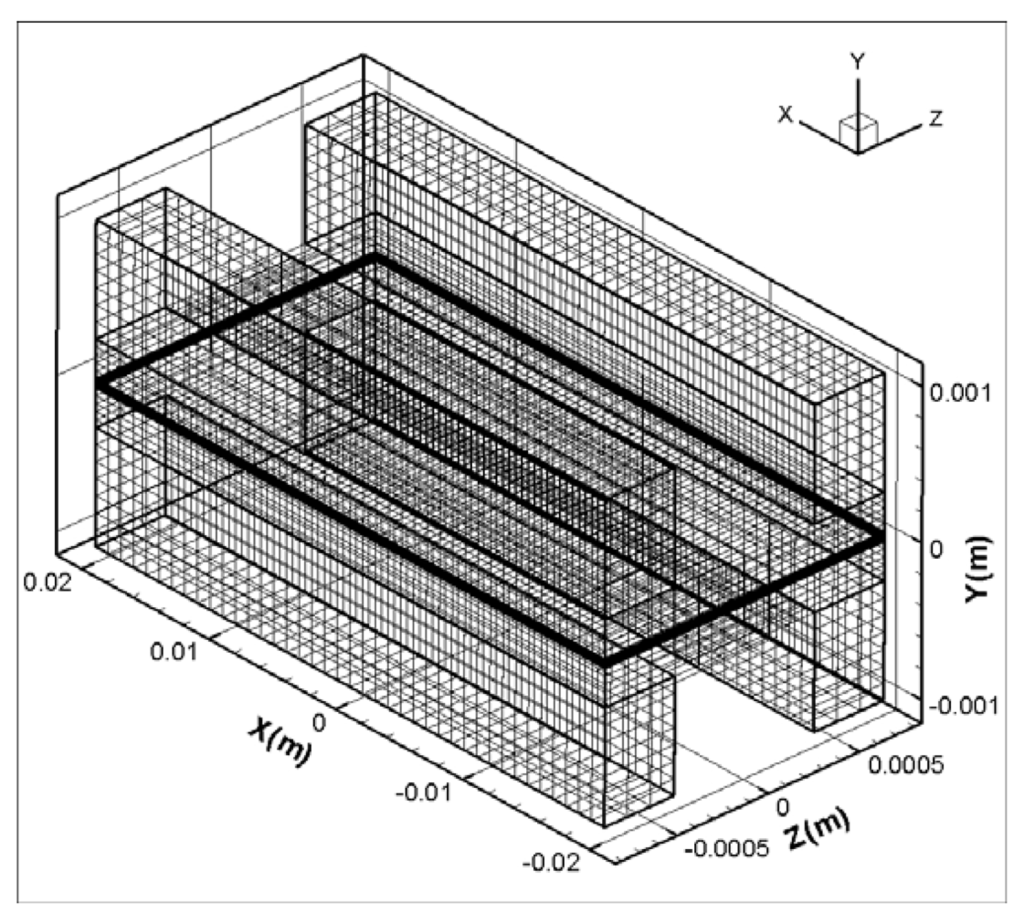 Figure 3 show the computational mesh structure for the micro parallel flow channel. Orthogonal non-uniform grids are employed for computational the domain. The micro parallel flow channels of anode and cathode are divided into 40 × 50 × 24 (total mesh number is 48,000). The numerical results using a mesh size twice as large as the present mesh size were almost same, so we used the present mesh size to save calculation run time.