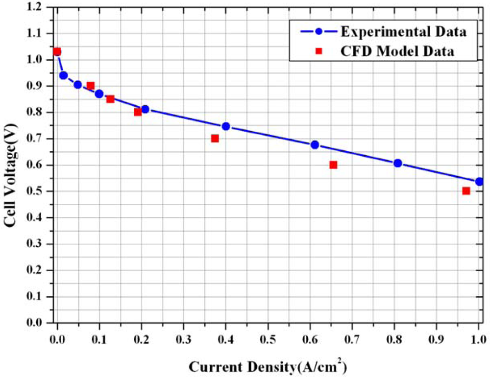 - The computed polarization curve is in good agreement with the experimental polarization curve at low and moderate current density. At high current density, the effects of two phase flow should be considered.