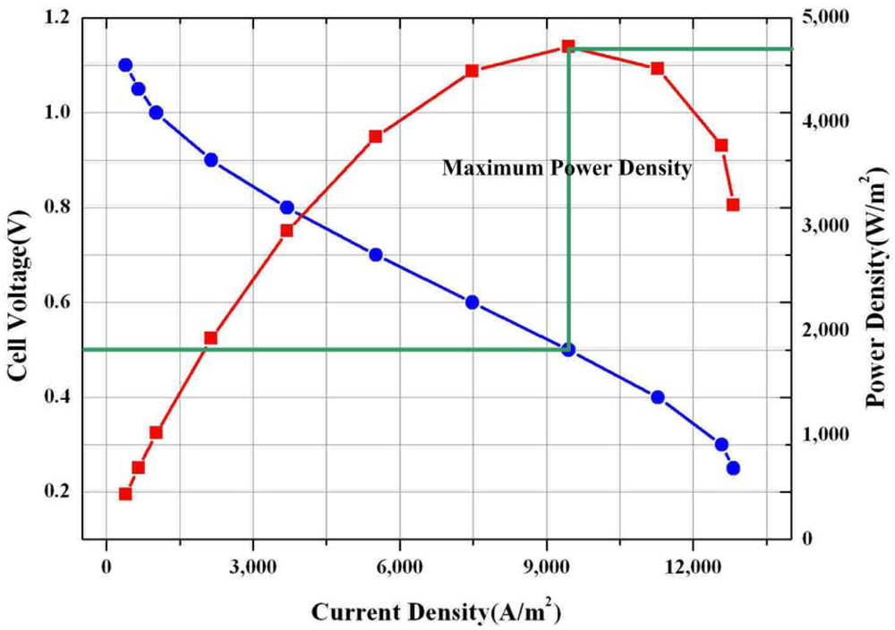Figure 5 presents the current density(i)–voltage(V) polarization curve for PEM fuel cell with micro parallel flow channels under conditions of 100% anode side relative humidity and 0% cathode side relative humidity. The current density increased with decreasing cell voltage. The voltage for the maximum power density at 0.5 V was found to be the optimal operation condition for the PEM fuel cell [,].