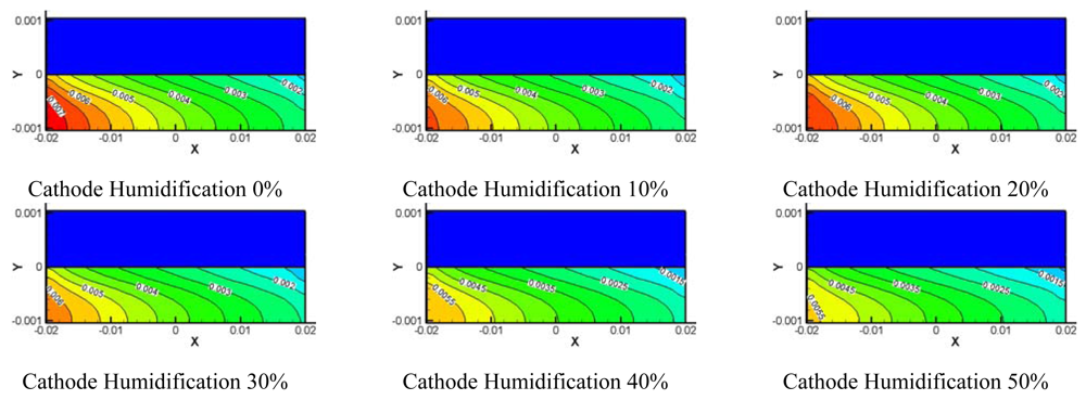 Figure 11 shows comparisons of the electro-osmotic drag flux at different humidity levels at the cathode side. A high region of electro-osmotic drag flux was distributed at the inlet of the micro parallel flow channel, which gradually decreased along to the outlet of the flow channel. The higher relative humidity at the anode side was, the higher the electro-osmotic drag flux became at the inlet of micro parallel flow channel. Also, electro-osmotic drag flux is generated much in 50–100% of relative humidity at the cathode side at the outlet of flow channel.