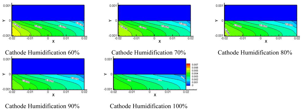 Figure 10 presents the comparisons of the distribution of oxygen concentration in the gas diffusion layer at the cathode side. The distribution of water concentration was opposite to the distribution of water concentration shown in Figure 10. As the humidity was increased and water concentration became greater, the proportion of oxygen and nitrogen decreased since the mixture ratio of water, oxygen and nitrogen is provided at a fixed value at the inlet of the flow channel.