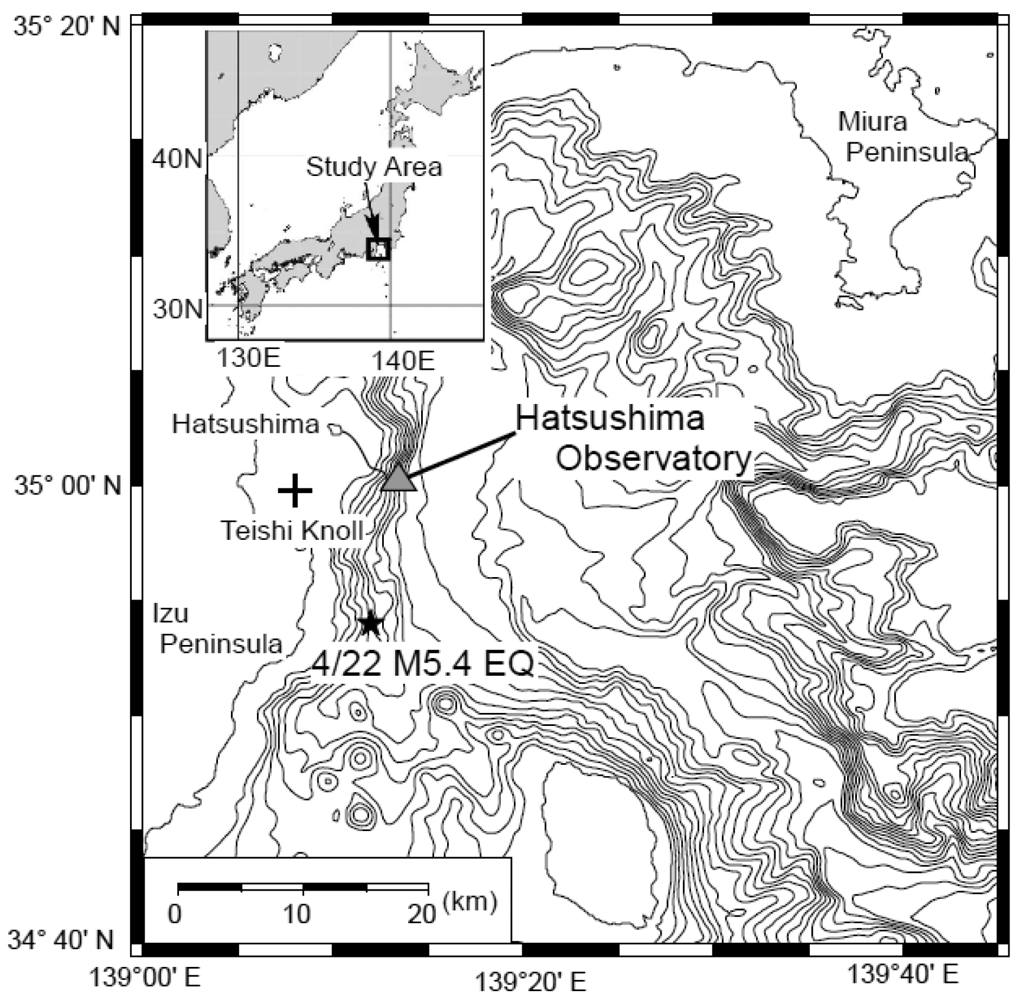 Location of the Hatsushima Observatory. A star shows the epicenter of the off-Izu Peninsula earthquake that occurred on 22 April 2006. Teishi Knoll is a submarine volcano that erupted in 1989.