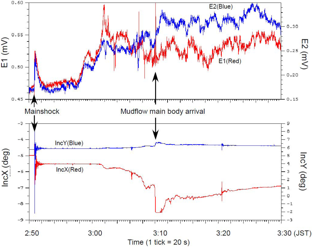 Figure 10 depicts the OBEM data obtained before and after the occurrence of the earthquake and mudflow. Magnetic components and inclinometer data showed, at first, high-frequency changes resembling those seen on the seismometer. A small data offset existed because the OBEM was shaken as the seismic body waves arrived. Electrical components also changed suddenly. However, these sudden variations differed from the variation of a magnetic sensor and inclinometer. Both electronic components rose, then reverted to the original data trend with the same phase. Subsequently, the inclinometer and electrical components started a gradual change before the mudflow main body reached it. Both electrical components increased at 2:58 just immediately after light transmission data became almost zero (Figure 8). Inclinometers showed gradual changes occurring simultaneously with the lack of visibility. Finally, large step-like changes occurred after the mudflow main body's arrival; then the waveform decayed. The magnetic components showed similar changes simultaneously. Furthermore, each electrical component diverged and showed a negative correlation after the arrival of the mudflow's main body.