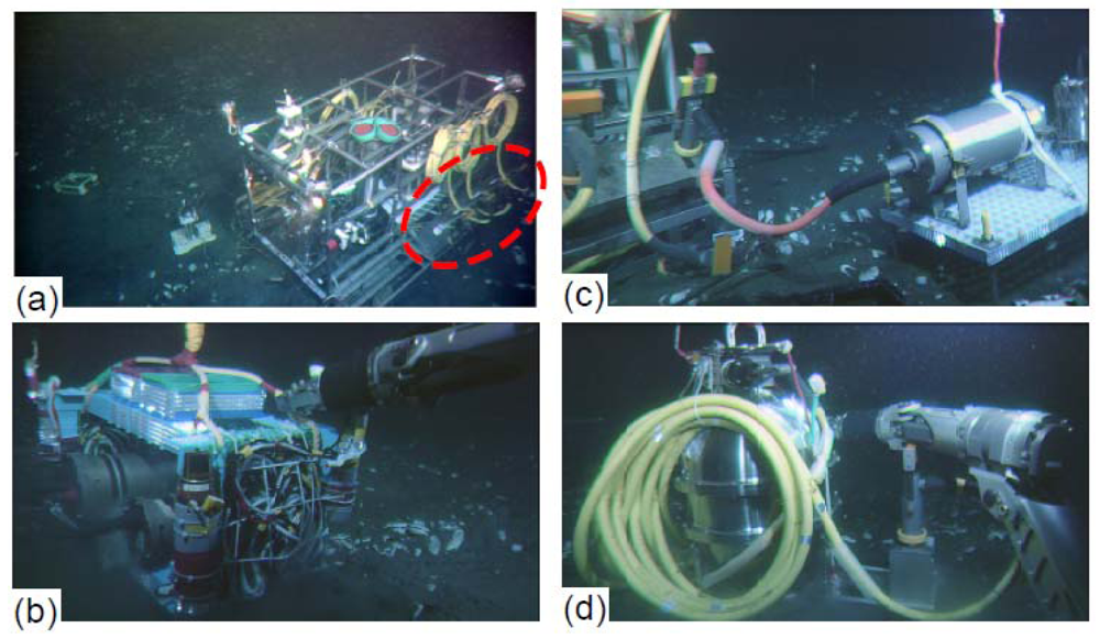 For multidisciplinary observation to monitor geophysical and biological phenomena, the Japan Agency for Marine–Earth Science and Technology (JAMSTEC) planned to construct a submarine observatory at a depth of 1,175 m about 7 km off Hatsushima Island in Sagami bay. The original observatory system was deployed and set up in 1993 []. This observatory had a seismometer, hydrophone, thermometer, a conductivity, temperature, and depth instrumentation (CTD), video camera, and an electromagnetic current meter. However, it had no submarine external port. Use of the original system was halted in 1999 because of a submarine cable fault; it was recovered in 2000. The system was completely renovated in 2000 for carrying out more multi-disciplinary observations with various other sensors, and for development of a more expandable system with underwater mateable connectors, aside from the reason that the primary observatory had broken []. Figure 2 (a) portrays a photograph of the renovated underwater observatory system (35.003083N, 139.2247E).