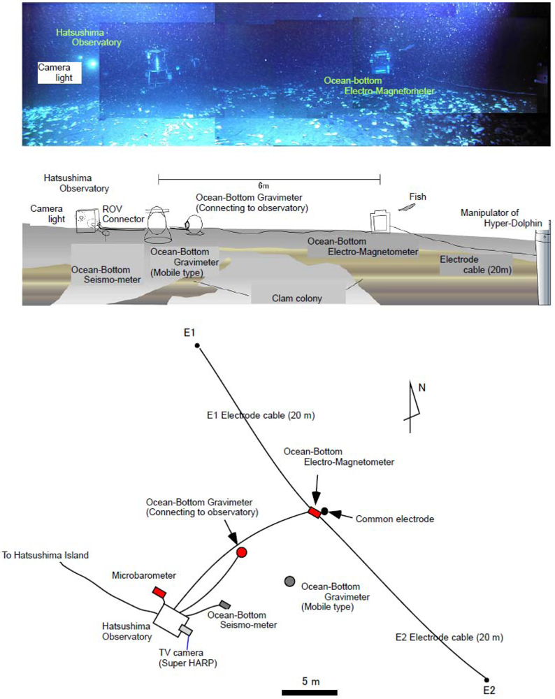 (Upper panel) Photograph and arrangement map of various instruments. (Lower panel) Plain view around the Hatsushima Observatory. Red marks show instruments placed by Hyper-Dolphin.