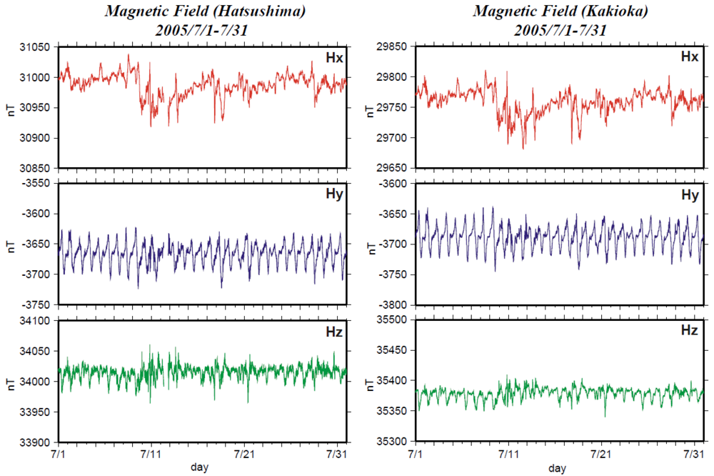 1-day comparison of the magnetic component's daily variation, as deduced by Hatsushima Observatory and Kakioka Observatory in Ibaragi prefecture.