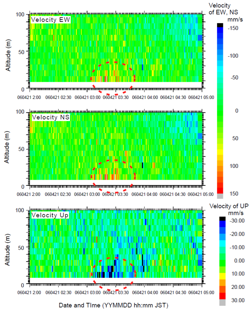 Three components of the current velocity time variations obtained using the ADCP sensor. The current direction changed downward and northeastward at 3:10. The mudflow thickness was estimated as about 30 m.
