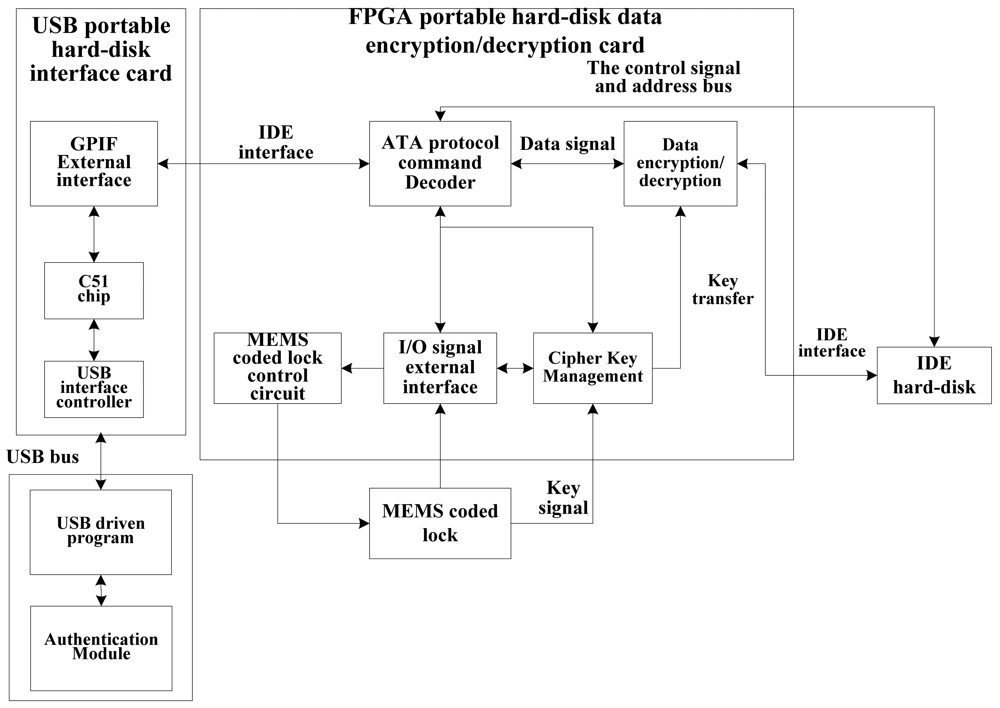 Figure 1 shows the portable hard disk encryption/decryption system with MEMS coded lock, which is realized by FPGA.