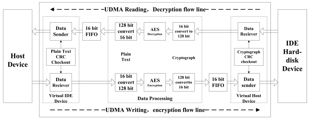 The cryptograph data from the hard disk is decrypted and transferred to the host device. The working flow of the decryption flow line is as follow: (1) The cryptograph data on the hard disk is received by the data receiver module; (2) The 16-bit width cryptograph data is converted into the 128-bit width cryptograph data; (3) The 128-bit width cryptograph data is decrypted into the plain text by the AES encryption module; (4) The 128-bit plain text is converted to the 16-bit width plain text; (5) The 16-bit width plain text is sent to the 16-bit width FIFO module; (6) The data sender module in virtual IDE device sends the plain text to the host computer.