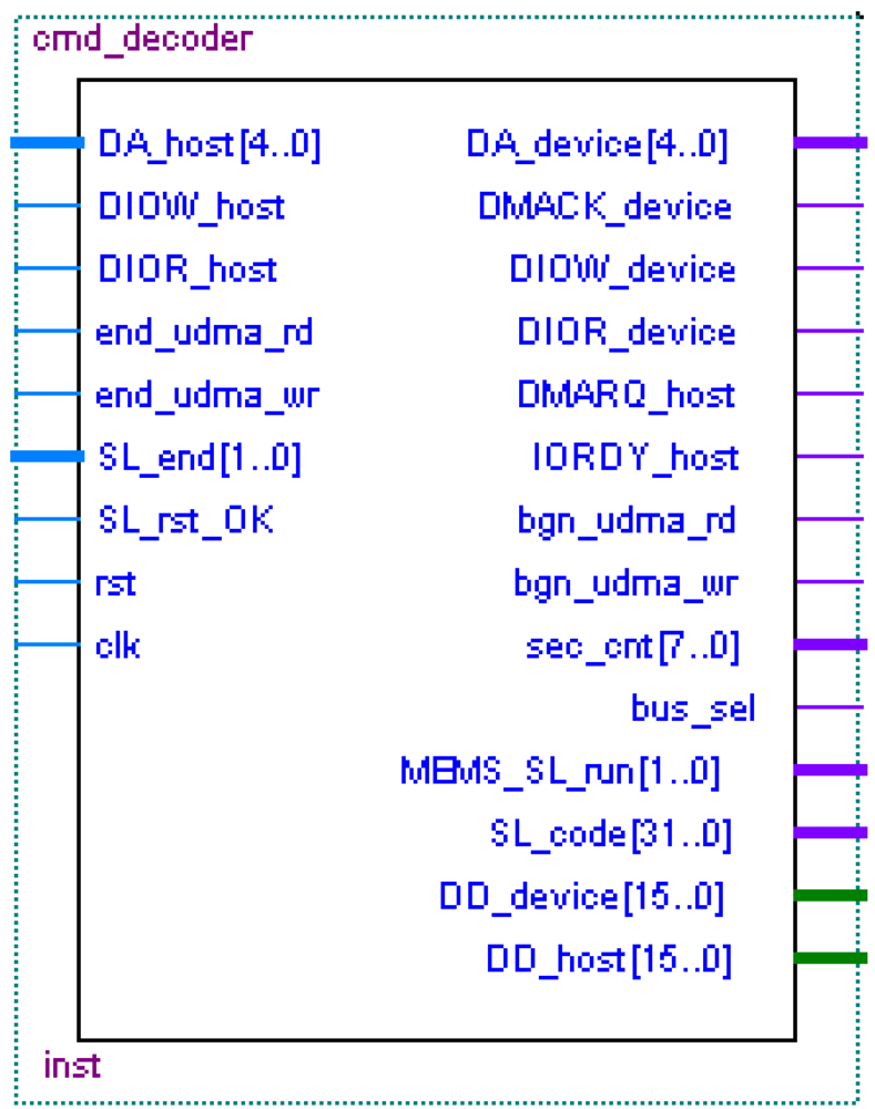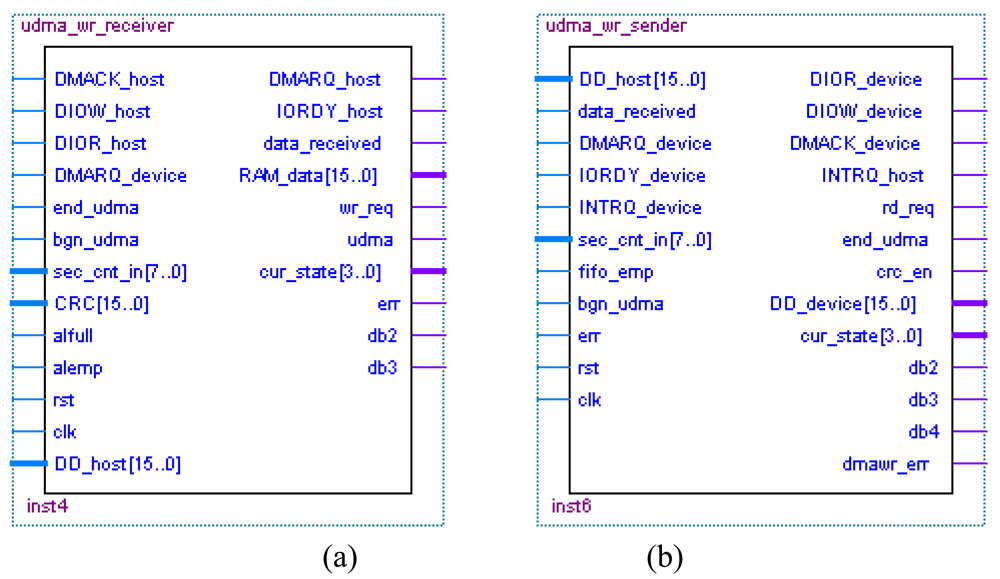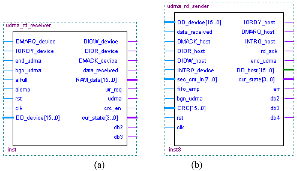 The data receiver module is named as UDMA_RD_Receiver [Figure 11(a)], which simulates the host device and communicates with the hard-disk. The data sender module is named as UDMA_RD_Sender (Figure 11b), which simulates the hard-disk, and communicates with the host device.