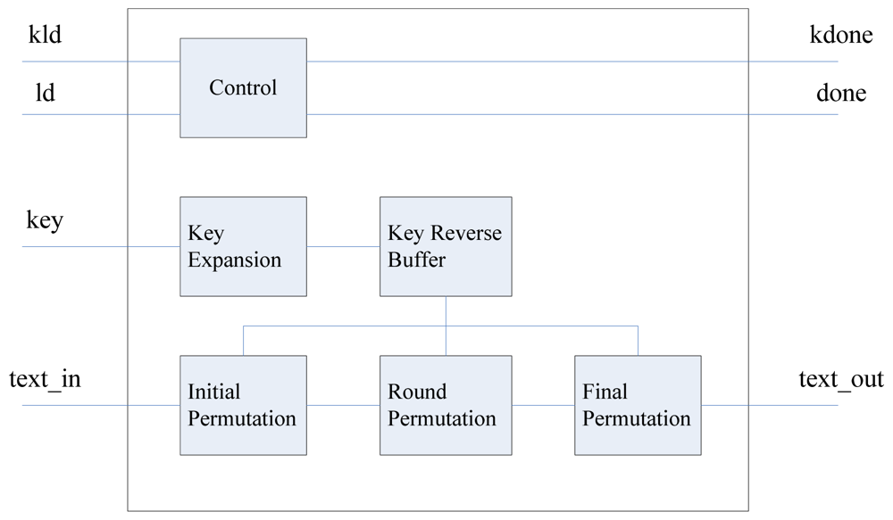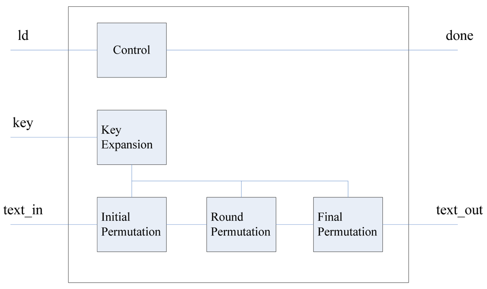 The AES encryption module (see Figure 10) is depicted in Figure 13, which includes the key expansion unit, the initial permutation unit, the round permutation unit and the final permutation unit. When ld signal is valid, the encryption module begins to read the key and plain text. After the encryption operation is done, the done signal is kept valid for one clock cycle.